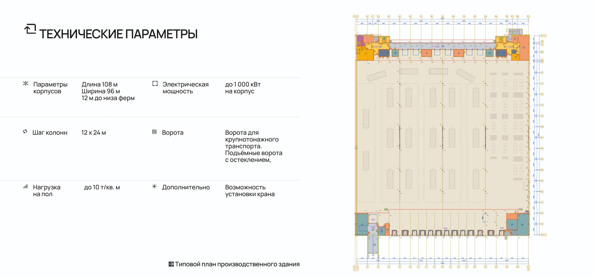 Проект занимает участок площадью 26 гектаров и включает 12 производственных корпусов общей арендопригодной площадью более 168 тыс. кв. м. Парк реализуется в три этапа: ввод первых корпусов запланирован на II квартал 2026 года, завершение строительства — на IV квартал 2026 года. Каждый корпус спроектирован как самостоятельный объект с собственной БКТП и встроенной котельной, что обеспечивает надёжность эксплуатации и операционную гибкость для резидентов.
